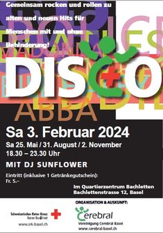 Am Samstag, 03. Februar 2024 ab 18.30 Uhr findet wieder eine DISCO für Menschen mit und ohne Behinderungen statt! Wir freuen uns, euch im Quartierzentrum Bachletten in Basel zu begrüssen und mit euch zu rocken und zu rollen!