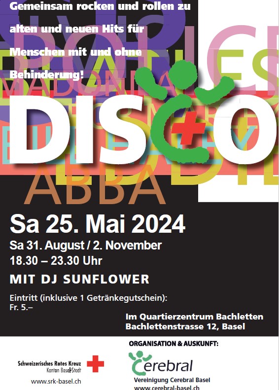 Am Samstag,25. Mai 2024 ab 18.30 Uhr findet wieder eine DISCO für Menschen mit und ohne Behinderungen statt! Wir freuen uns, euch im Quartierzentrum Bachletten in Basel zu begrüssen und mit euch zu rocken und zu rollen!