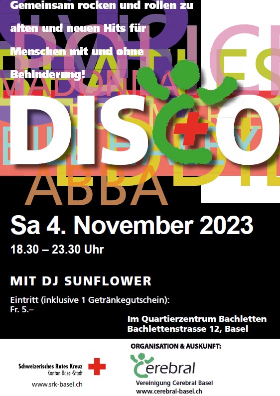 Am Samstag, 04. November 2023 ab 18.30 Uhr findet wieder eine DISCO für Menschen mit und ohne Behinderungen statt! Wir freuen uns, euch im Quartierzentrum Bachletten in Basel zu begrüssen und mit euch zu rocken und zu rollen!