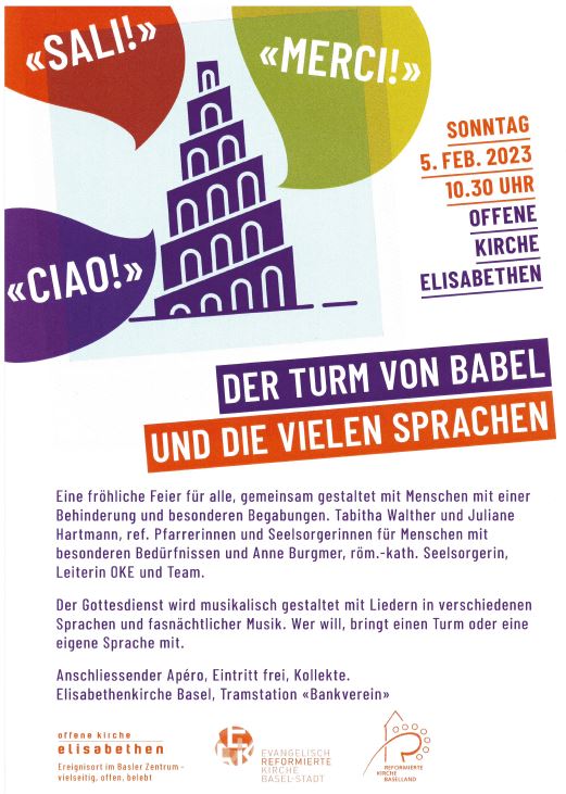 Eine fröhliche Feier für alle, gemeinsam gestaltet mit Menschen mit einer Beeinträchtigung. Der Gottesdienst wird musikalisch gestaltet mit Liedern in verschiedenen Sprachen und fasnächtlicher Musik. Eintritt frei, Kollekte.